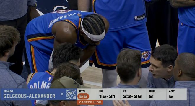 这场比赛亚历山大一个人疯狂爆轰55分创造个人得分新高,血战双加时出手了31次,虽然有16个打铁,但是也进了15个球,关键是罚球太多了,26罚23中拿了55分8板5助2断,这真是有点厉害,而且看亚历山大有多强,你光看他的罚球数量你是看不出来的。